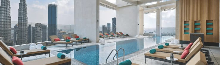 The Petronas Twin Towers and the stunning city skyline through large window panes, a generously spaced living area, a private relaxation pool and elegant bedroom create a relaxing suite experience. Occupying a spacious 90 sqm, this hotel suite in Kuala Lumpur is equipped with a king-size bed and comes with an aromatherapy kit.