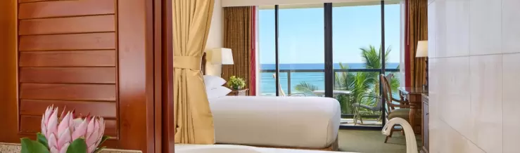 The resort offers a range of accommodations with private balconies providing views of Waikiki Beach or the city skyline. Options include oceanfront rooms, city view rooms, and exclusive suites with access to the Voyager 47 Club Lounge, which provides complimentary breakfast and evening appetisers.