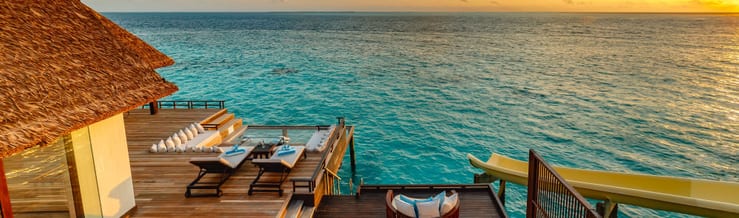 Poised over the lagoon, these graceful villas set the mood for a serene island escape. These grandiose suites boast water slides to add a touch of adrenaline to your stay! Lounge on the hammock as you watch baby sharks and reef fish swim beneath you in the dappling turquoise waters. Sip a glass of wine from the maxi bar, filled twice daily, as you soak in the sunset view with your loved one.