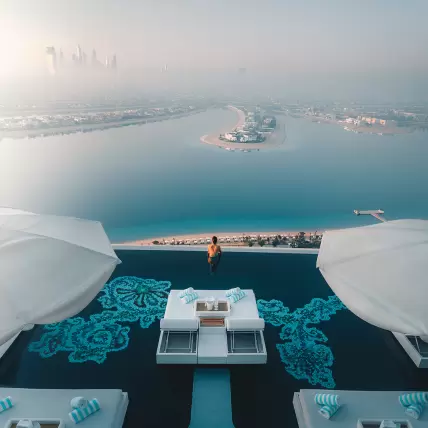 22 storeys up is the sky infinity pool with areas for unwinding, dining, and dancing the night away. As well as taking in amazing views over The Palm. Down on the beach's golden sand is a chic beach club with infinity pool, open-air terrace, and oceanfront cabanas.