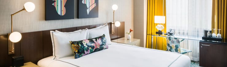 Guestrooms are characterised by refined elegance and modern style. Featuring designer decor and adorned with original artwork and pops of colour, rooms offer a sophisticated ambiance. Featuring king or queen beds topped with luxurious linens, accompanied by premium amenities and mini fridges to ensure a stylish and comfortable stay. And for more space, suites offer added comfort with sofa beds.