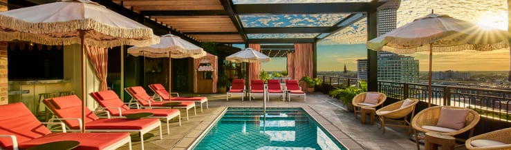 Head up to the rooftop pool and have some fun in the sun. Sip on cocktails, beer or wine between dips in the pool. Enjoy some light bites while you savor the rooftop sights from the wrap-around lounge deck and VIP poolside sofas. Or be tickled pink by the golden hour specials.