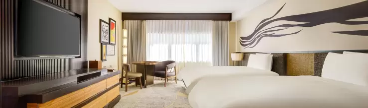 Named Best Boutique Hotel by Vegas Seven, Nobu Hotel inside Caesars Palace emanates style and sophistication. Featuring contemporary and traditional Japanese art, and sleek décor with splashes of gold and purple, the spacious and luxurious Las Vegas hotel does not disappoint. This room has two queen size beds. Exclusive room amenities include exotic-scented sleep oils and tea. Guests also have personalized concierge assistance and priority access to Nobu Restaurant. Nobu redefines both elegance and service.
